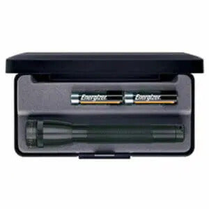 MAG-lite flashlight of aircraft grade aluminum with two AA Energizer alkaline batteries in a presentation gift box. Includes spare bulb in tail cap. Lifetime warranty.